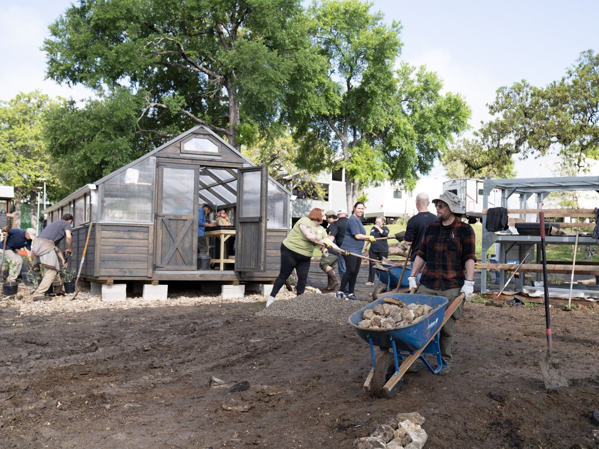 Volunteers from HomeAid and Taylor Morrison — plus other interested Austinites — added gravel as ground cover next to the greenhouse, dug out and arranged stones around a rain garden, and got some plants started inside. Next on the to-do list is installing a ramp so that residents with mobility aids can easily enter, installing a ceiling fan (even on a breezy spring day, it felt like summer under the plastic roof), and putting a lot more plants inside.