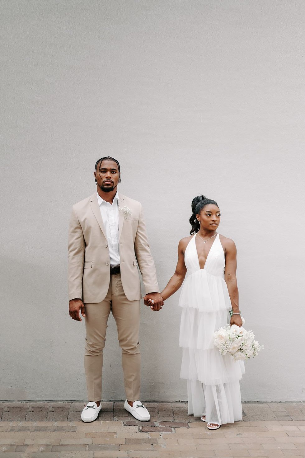 Biles is seen toting an all-white bouquet from bespoke floral designer Maggie Bailey of Bramble & Bee.