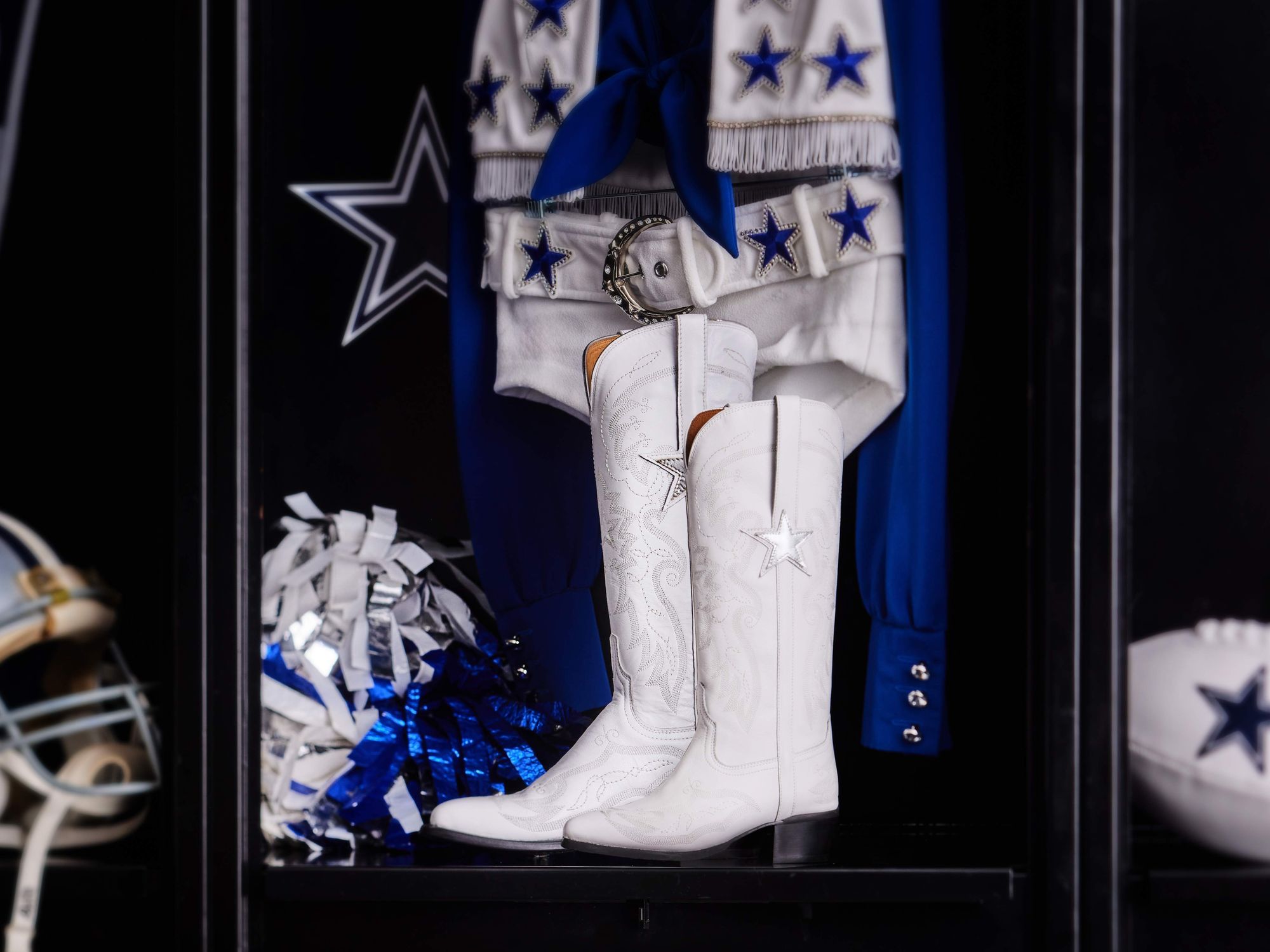 The UT cheerleaders are also adjacent to an even more recent design choice. This August, the Dallas Cowboys named Lucchese as their "official boot," which the bootmaker celebrated with a themed collection. It included Lucchese's first-ever child's boot. Among other styles in the collection, these white boots mimic the ones the Cowboys' famous cheerleaders wear.