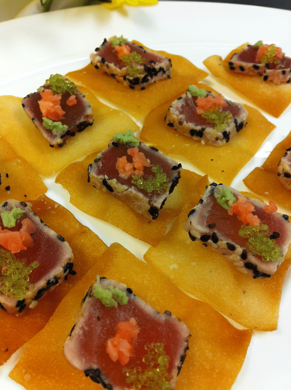 LM & MW: Novel serving dishes are huge — like soup shooters and miniature desserts. Think chilled cantaloupe soup garnished with crispy prosciutto and little chocolate pots de creme with mascarpone whipped cream on top. Totally adorable (and delicious!).