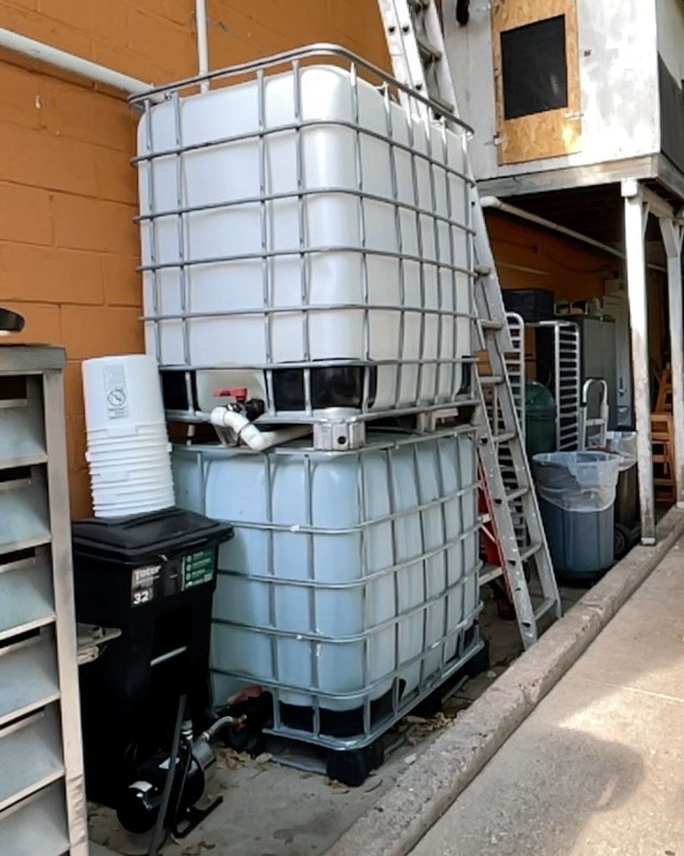 The condensation runoff is captured form the air conditioning system through a series of pipes that funnel directly into the two massive 250-gallon receptacles in the restaurant’s rear lot.